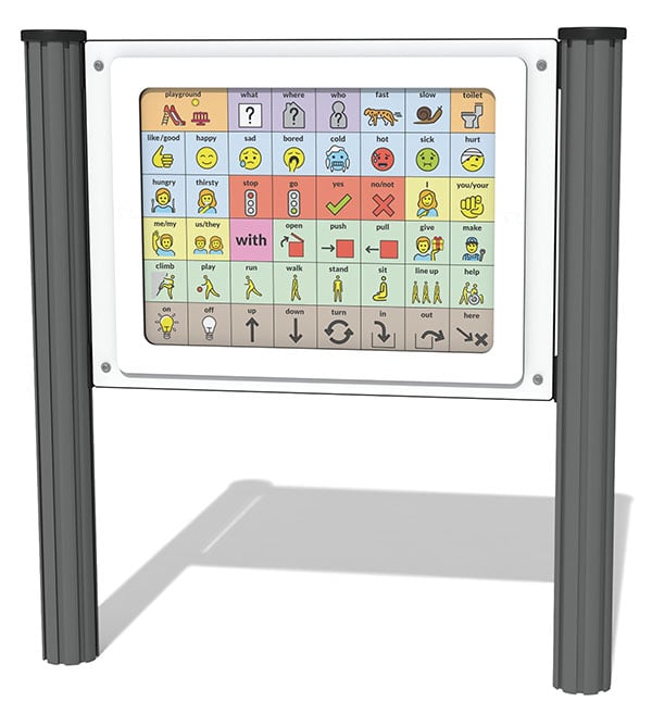 Fitzgerald Key Communication Panel designed specifically for children who have difficulty communicating verbally, such as those with Autism. Children can express their thoughts by pointing to the panels symbols, which have been specially selected for playground environments.