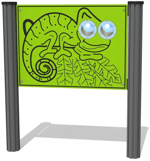 With the Bug Eyes Chameleon Play Panel, children can have fun imagining they are looking through the eyes of chameleons while from the other side it looks like the chameleons are coming out of the panel at you! The product is made from a large HDPE panel with shatter-proof polycarbonate domes.