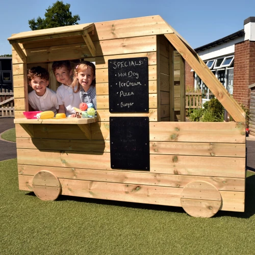 If you are looking for a resource to enhance imagination on the playground, then look no further! Playscene has designed and manufactured this magnificent food truck to do just that. Perhaps it isnt a food truck. Maybe its a caravan? Or an ice cream van? It could be anything your imagination creates! Inclusive of a mini kitchen inside, and chalkboards inside and out; this resource holds multiple educational benefits for early years. The opportunities really are unlimited with this impressive, robust resource.